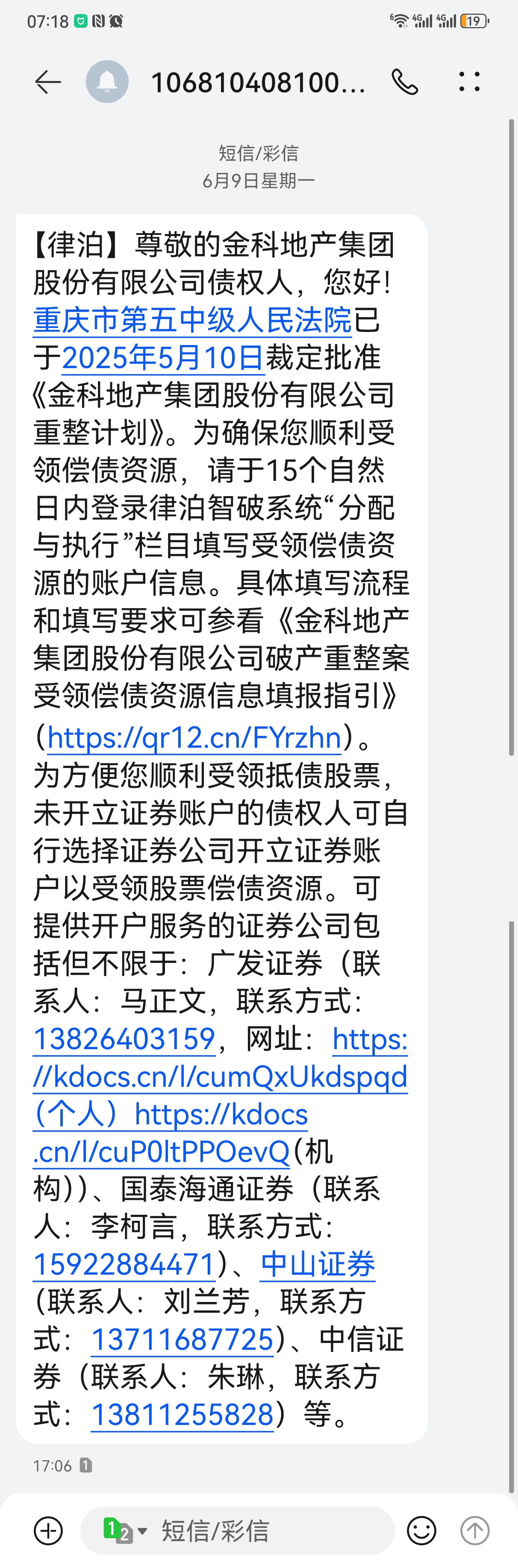“【中信信托】【中信信托·金科股份破产重整专项服务信托】尊敬的债权人:本信托现已开放信托份额受领,为依法保障贵方合法权益,请您登录网站【https://amcai.citictrust.com.cn/login】,按照系统提示提交相关信息及材料,完成身份验证,并受领信托份额。您的初始登录账号为【**********】(为防止信息泄露部分字段以*号隐藏,请填写完整证件号码,如登录账号显示后缀“-1”...上网登记过了,只要求确认银行账户不涉及股票账户,应该和折算多少股票无关吧