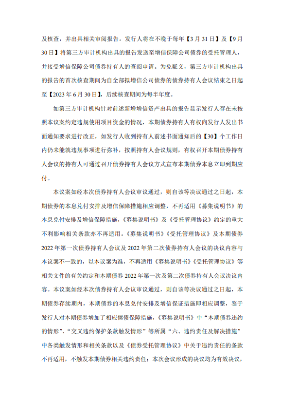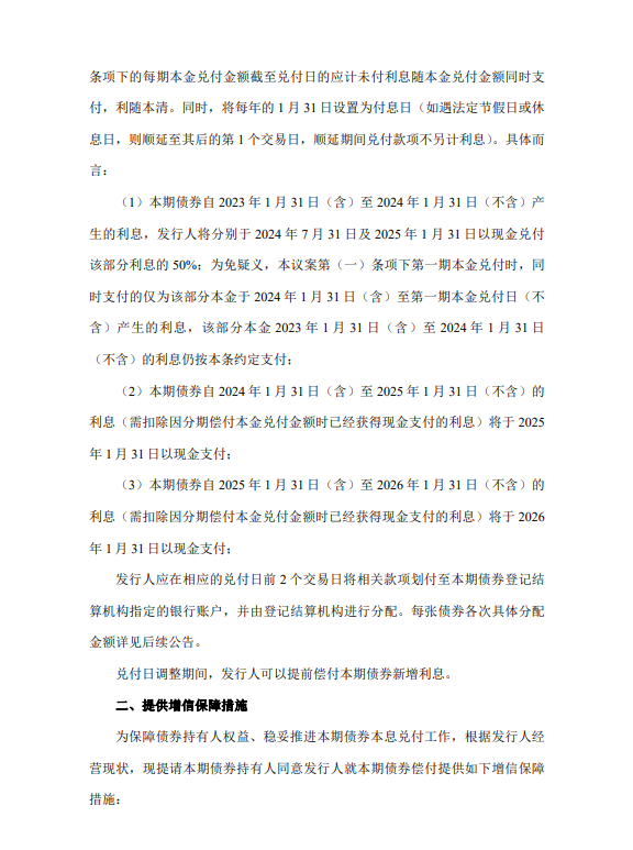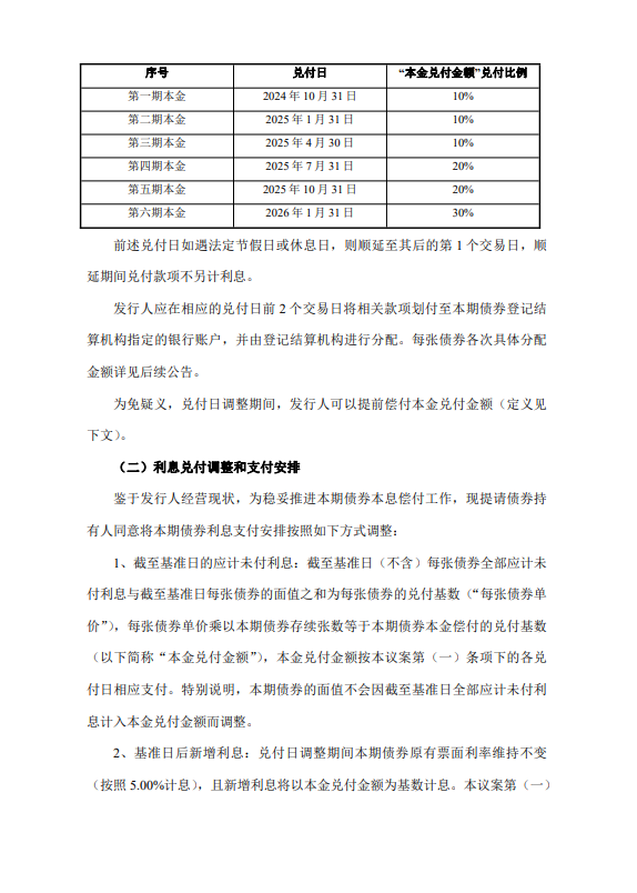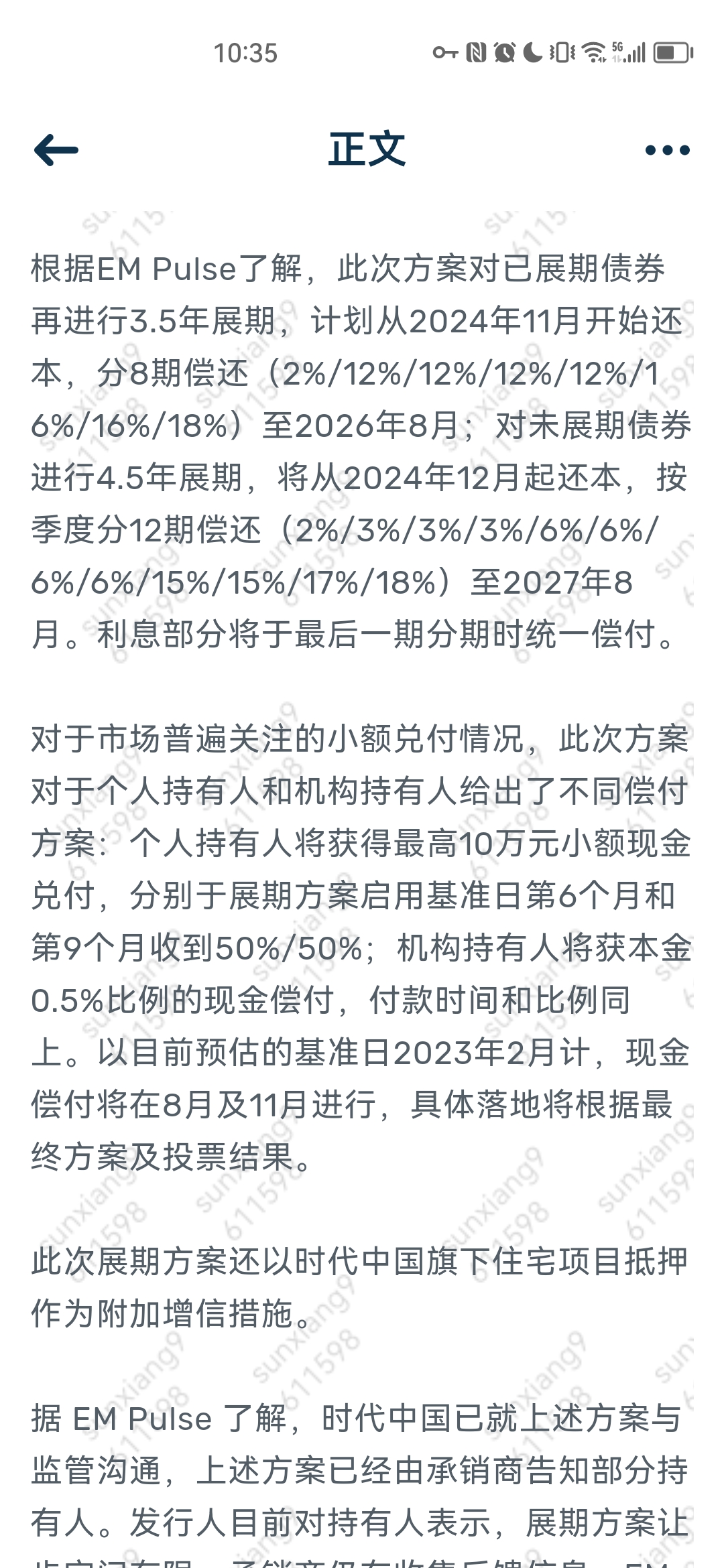时代拟展期方案:已展期组:展期3.5年左右,加权2.8年,24年11月开始还本,按季度还本至26年8月;未展期组:展期4.5年左右,加权3.7年,24年12月开始还本,按季度还本至27年8月;小额:初定机构每个按账户还0.5%,展期通过后的第6月、12月分别还50%;散户预计10万增信:增信股权、股权受益权 有三方监管、无信托结构特殊:无年度付息安排,利随本清,这条比其他家差一些有没有用公司户交易的,都去反映下情况,欢迎私信交流。