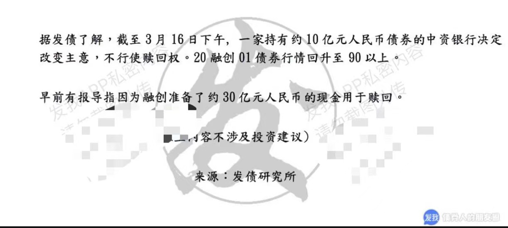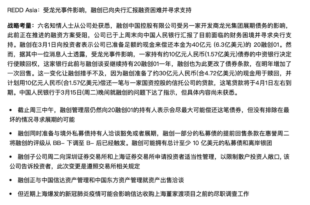 融创估计后面公募也要展期了。从龙光的反馈来看,监管认为展期不算违约,引导地产商展期债务,保交楼,拉长还债周期来软着陆。既然迟早都要展期,那么20融创01也悬了,在孙宏斌的一念之间了。如果监管认为展期不算违约,那么债券就没投资价值了,这个市场废了。今天地产困难能展期,明天城投困难也能展期,所有的发债主体都能谈展期,那还玩个什么?