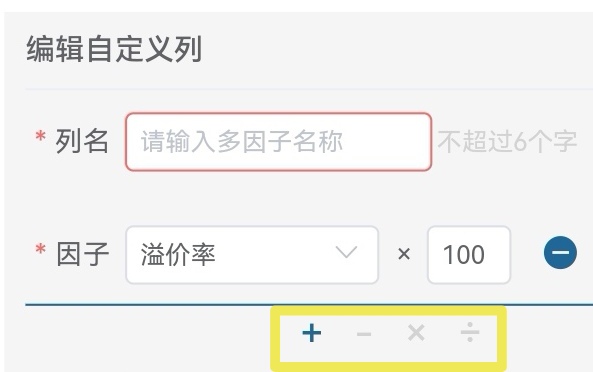 提个很简单的小建议:自定义数据列表,因子的运算符,能否在+-×÷旁边加个(),如图中黄色框标注。没有括号的话,7个格子不够用。比如,a*b*(c+d-e),有括号,就占用5格。没格号,得a*b*c+a*b*d-a*b*e,就占用9格了。