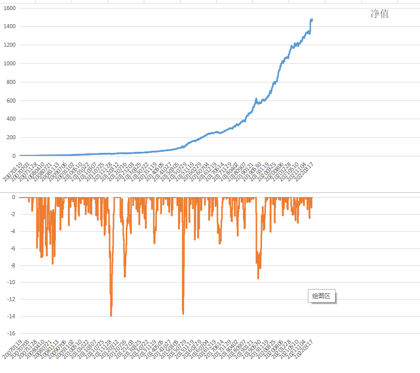 我也做了一个中证500多头策略,大概25%的天数策略会触发,持仓周期为一天,从2007年开始回测,效果确实吓人,目前正在实操,年底再看看结果。上面是净值曲线,下面是回撤曲线。这两图是用EXCEL做的,回测程序和数据库都是我自己写的,至少可以保证数据和算法不会有问题。垃圾债对个人关门了,得想办法开辟新的投机策略。这个目测2007/01-2016/06,大概是9.5年200倍,年化约75%;
