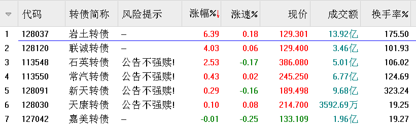 妖债横行的一天,老套路吧,市场没系统性机会时游资就会来搞妖债,懒人就低价摊饼,时常心情愉快;水平高的就挖掘潜伏;我个人喜欢搞相对低价小盘正股活跃换手率高的。不管哪种方式,能赚钱就好,但千万谨记妖债飞起别追高,游资就等你追呢。