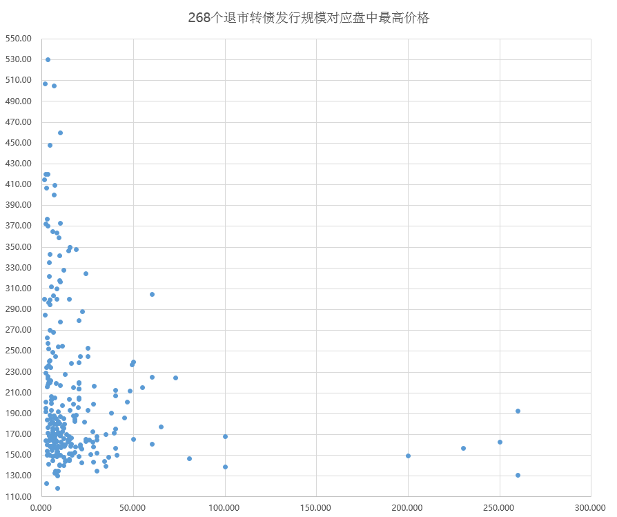 借@taiguohou55 提供的数据(https://www.jisilu.cn/question/450261),剔除了3只超过600元的转债(不利于画图),分析了268只已退市转债盘中最高价格。