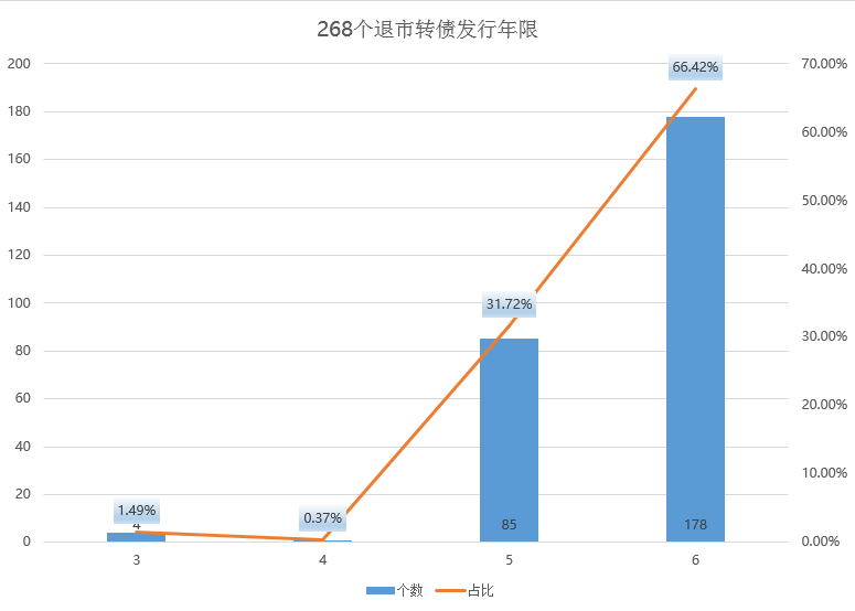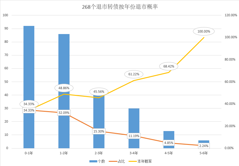可以得出的结论是倒数第三年,也就是剩余期限2.x年,和倒数第二年,就是剩余期限1.x年的转债,强赎退市的概率明显更高,达到了60+%,是第一年30+%的两倍,也远高于第二第三年的40+%。