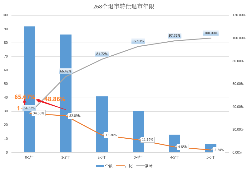 比如第一年退市了34.33%,那么来到第二年的实际只有1-34.33%=65.67%,第二年退市的概率应该按照65.67%的基数计算,也就是32.09%÷65.67%=48.86%