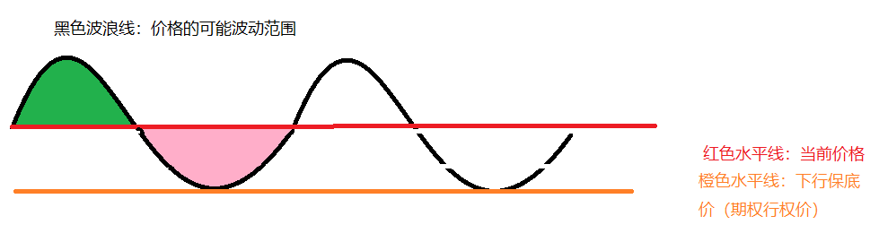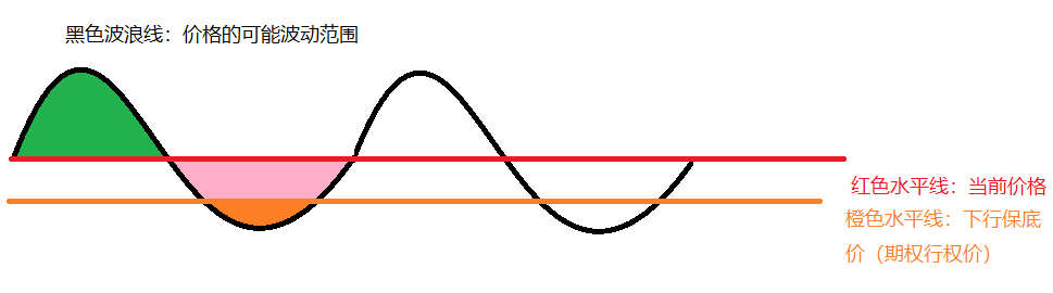假设红色水平线是当前资产价格,橙色线为保底线,那么很明显,如果价格根据预定波动率随机波动,我们的潜在盈利空间是绿色的面积,我们的潜在亏损空间是粉色部分,而橙色面积就是下有保底这一特征带来的投资优势部分(股票会亏而期权类资产不会亏的收益)。