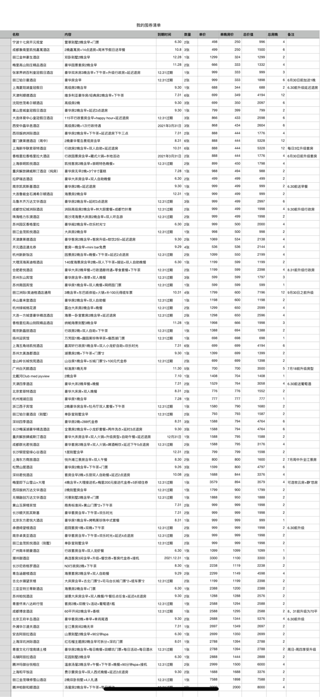 人就是容易上头,我后来回头算算,我居然光屯券就屯了二十多万,券的有效期是到2020年底,从5月份到年底都只有200多天了,我居然屯了300个房晚。。。除非是使用影分身,不然一个身体真的住不过来了,但是看着这些券就像看着自己的孩子,一个都舍不得退。因为平台实在太多,我还做了个表格按照价格从低到高来管理,防止自己遗漏好玩的。