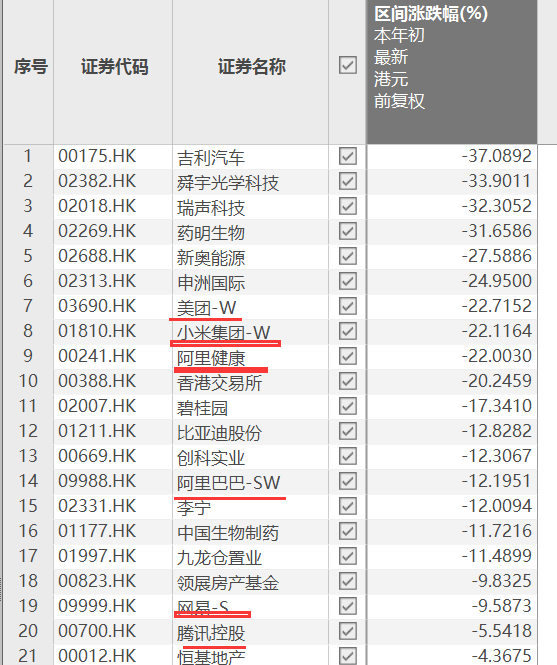 第二大权重行业是信息科技业,有六个巨头,腾讯,阿里,美团,网易,京东,小米;除了京东都是跌的,权重大而且跌幅大