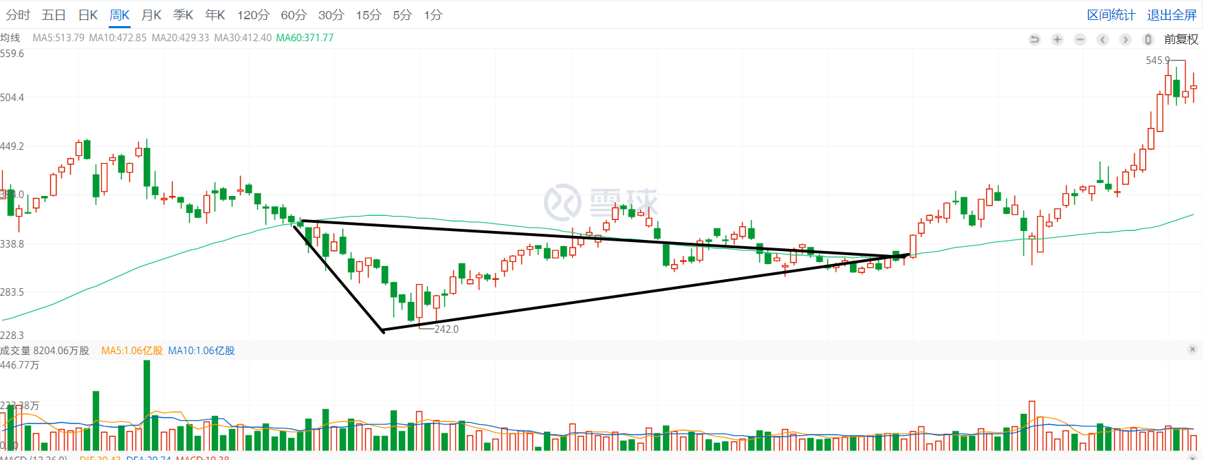 上图中概老大腾讯18年底的三个阶段,下图是现在的周线。均线用60MA。