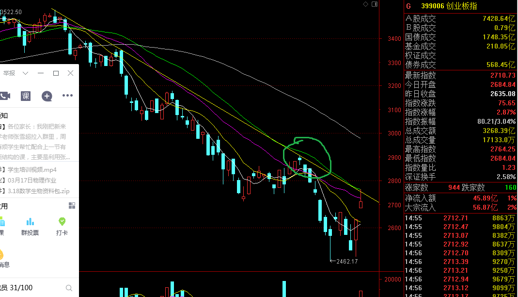 2,第二张图是创业板的指数图,很明显3月初的时候最高打到下降趋势线,然后下跌,下降趋势线压力很大,包括今天创业板最高也打到我画的下降趋势线,然后冲高回落看我画的黄线