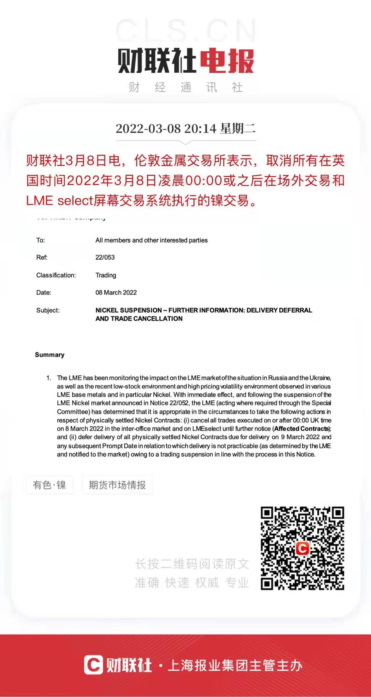 20:14 财联社3月8日电,伦敦金属交易所表示,取消所有在英国时间2022年3月8日凌晨00:00或之后在场外交易和LME select屏幕交易系统执行的镍交易。(来自财联社APP)