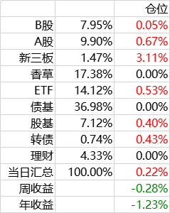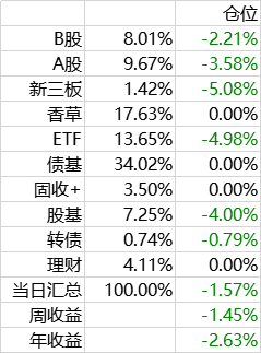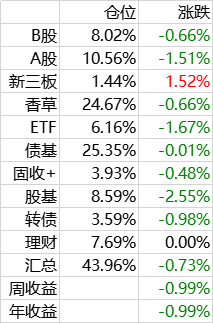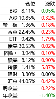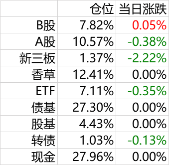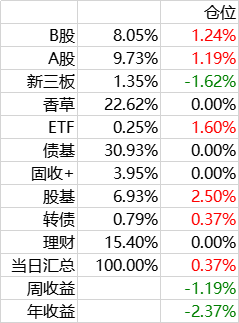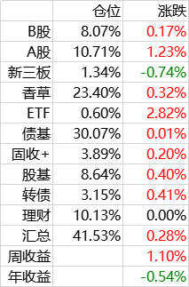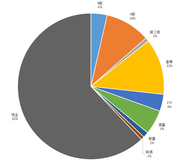 A股组合,以高息股为主,股息率平均在6%以上,过去新股有每年10%的加成。考虑到新股不景气,这部分持仓未来不会变,先观察一段时间。保持在10%仓位。