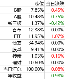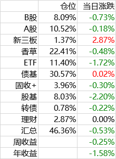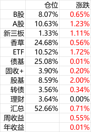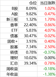 权益类由B股,A股和股基组成。B股收息,A股打新,股基进攻。持仓多的品种包括粤高速,苏威孚,安科等,基金主要是何帅的两个基金,观察了历史成绩,何帅的历史曲线和我非常接近,而且比我的收益要高一点,准备相信他一次。