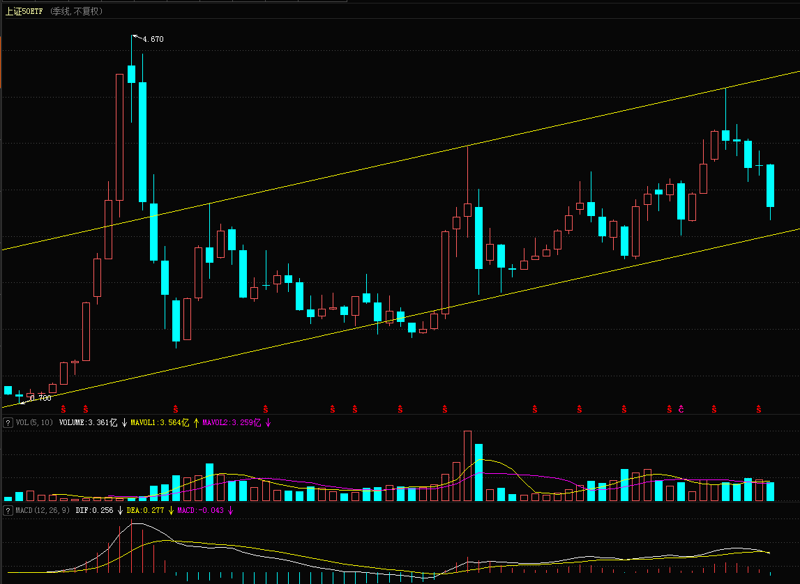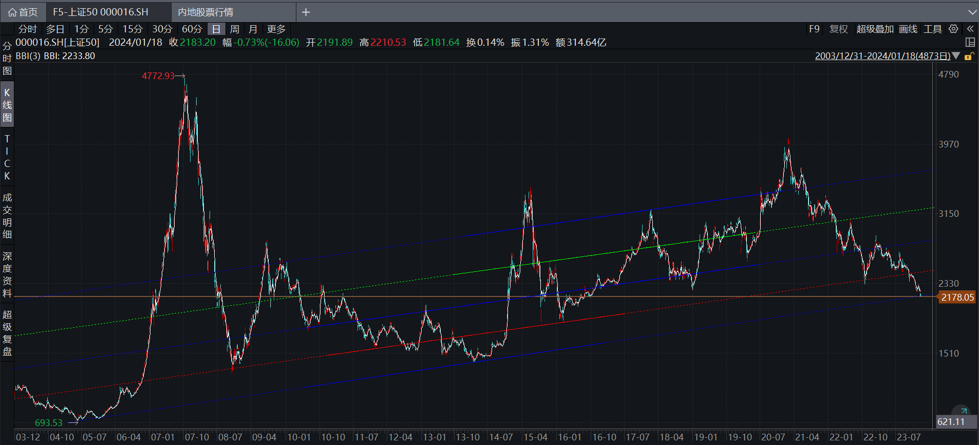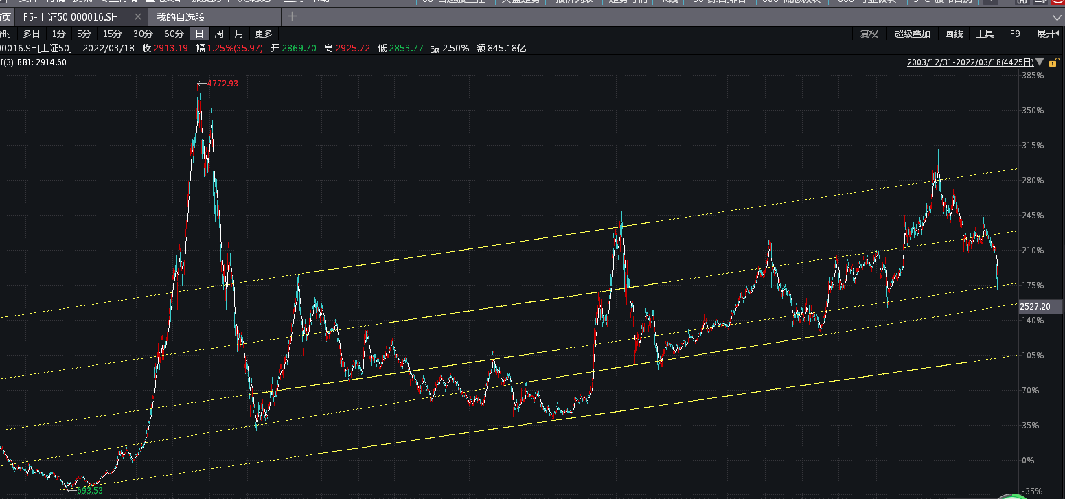 之前我说2500还有人认为是飞镖,看这趋势马上到了,最低点我划线是2100左右,不知道能不能到,再低我也看不懂了,这是我划线的极限位置了。再次插个眼,当前上证50指数在2300左右,随着时间推移当时划线最低点2100已经上升到2150左右。