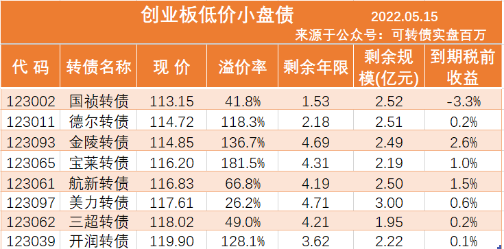 小盘债:东时转债、锋龙转债、翔港转债、三超转债、海波转债、金陵转债、航新转债、维格转债、德尔转债、美力转债、国祯转债、迪贝转债。共12支。