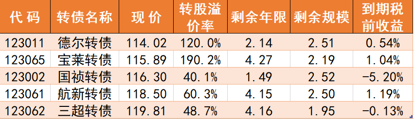 小盘债:翔港转债、德尔转债、维格转债、锋龙转债、航新转债、宝莱转债。