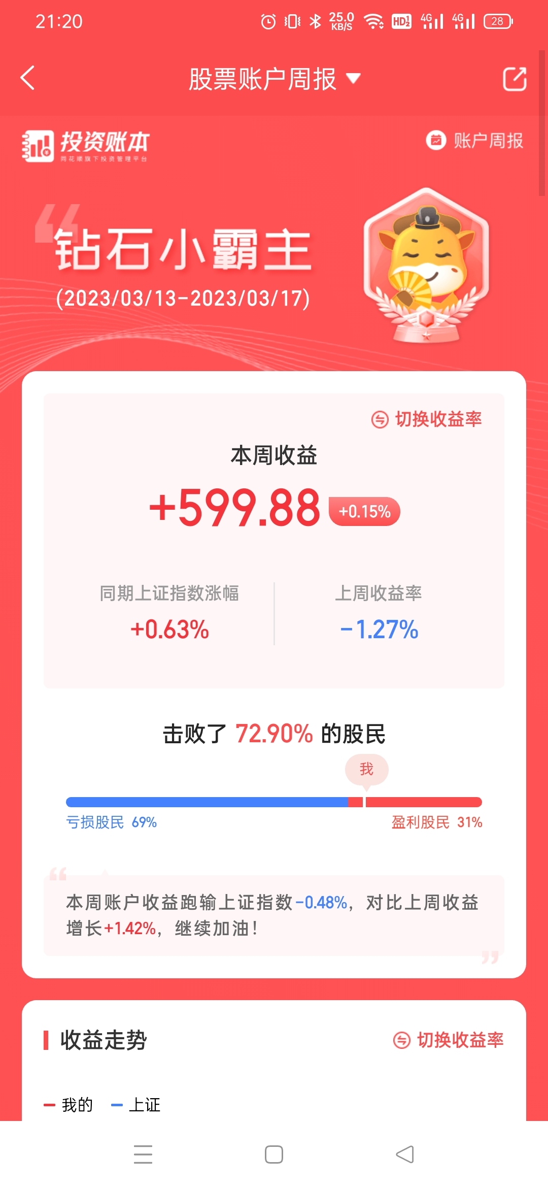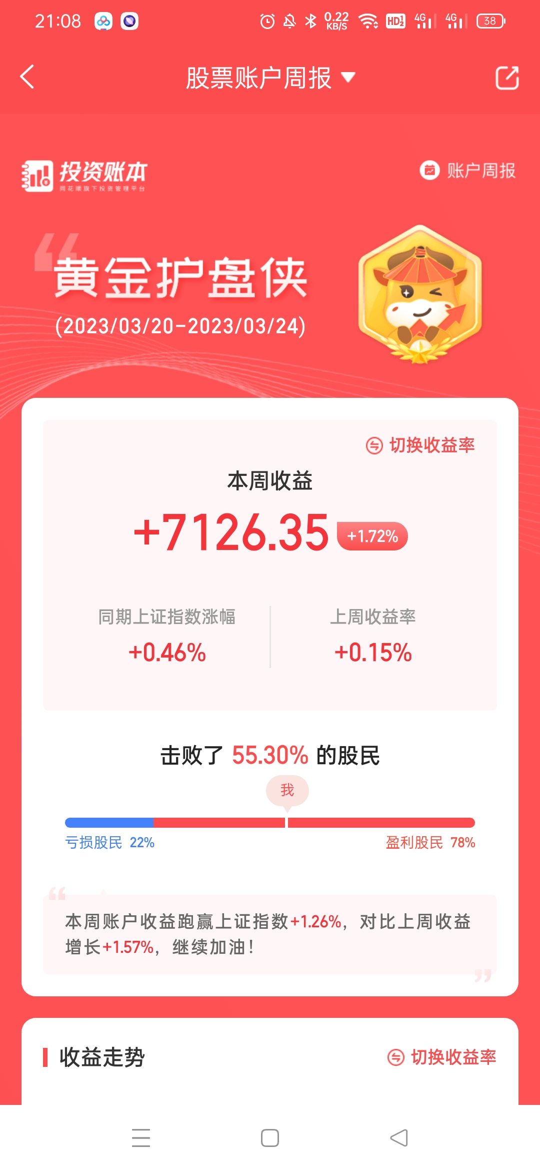 一季度收官,这个收益自己还算满意,收益率约7.1%,绝对收益抵得上一个人的到手工资了,说到底还是工资太低,说实话收入高了对回撤的容忍度会高很多,因为预期有钱可以加补仓。对今年还是蛮期待的,感觉大环境,政策都有好转的迹象,大蓝筹股可能会走好,就像潍柴,去年经理腰斩,但目前却是我今年收益最好的个股。