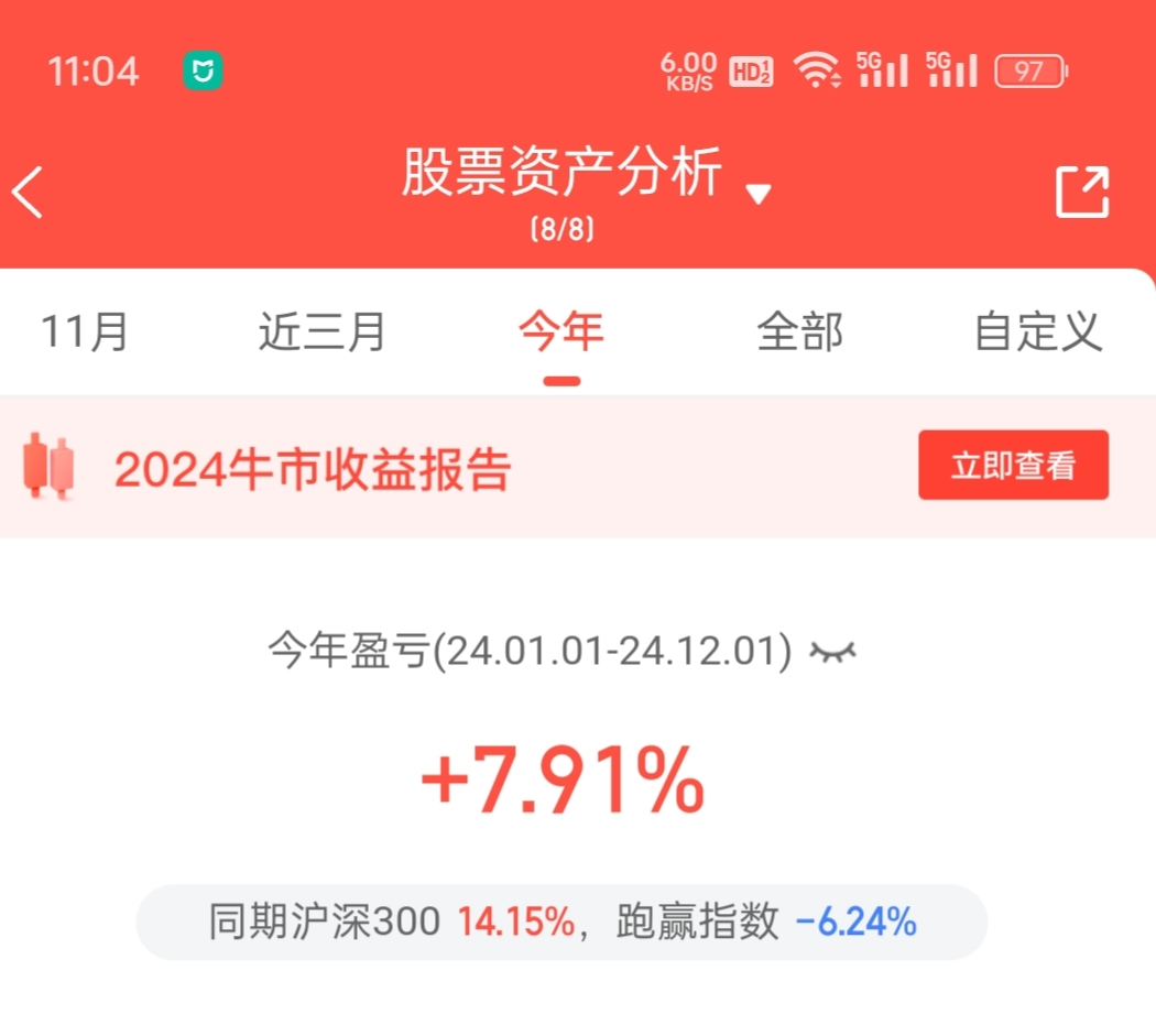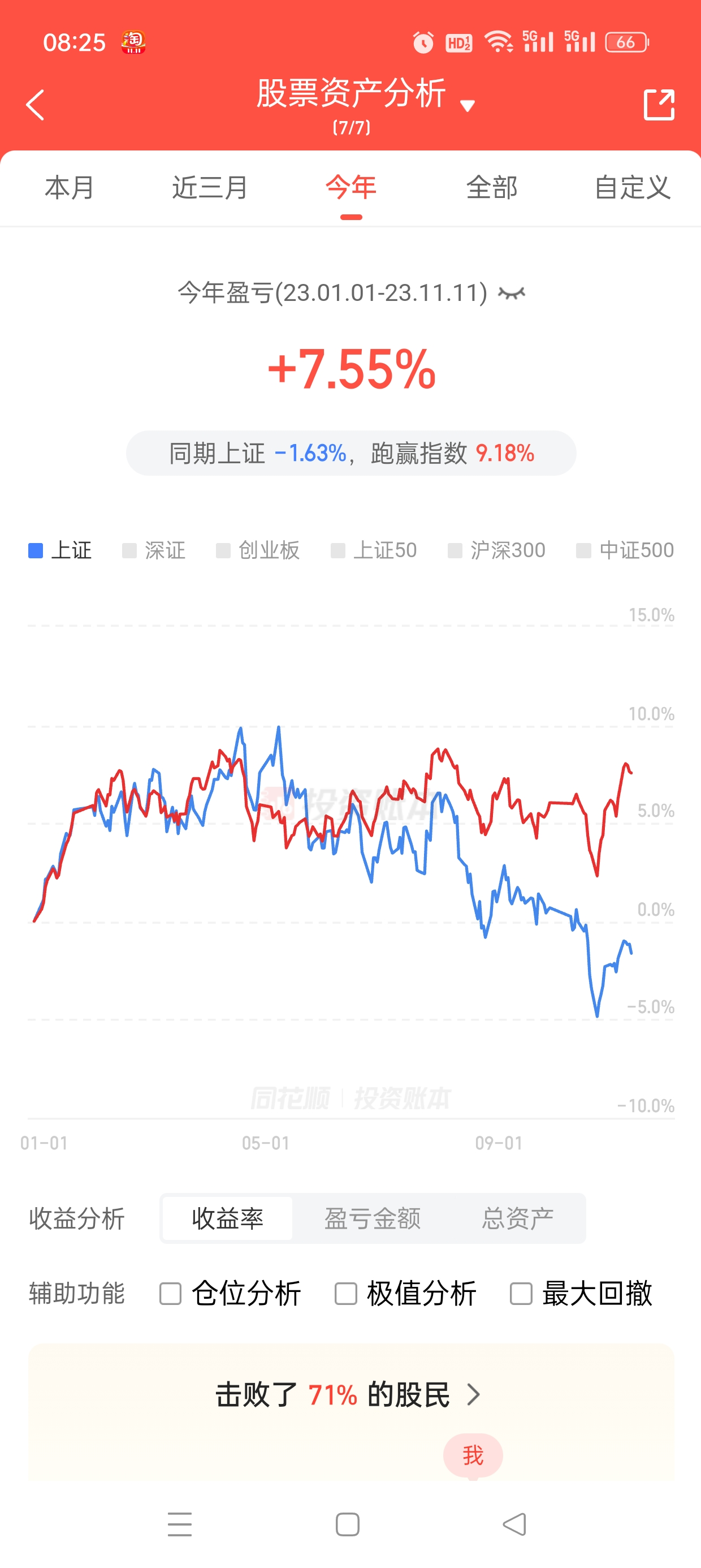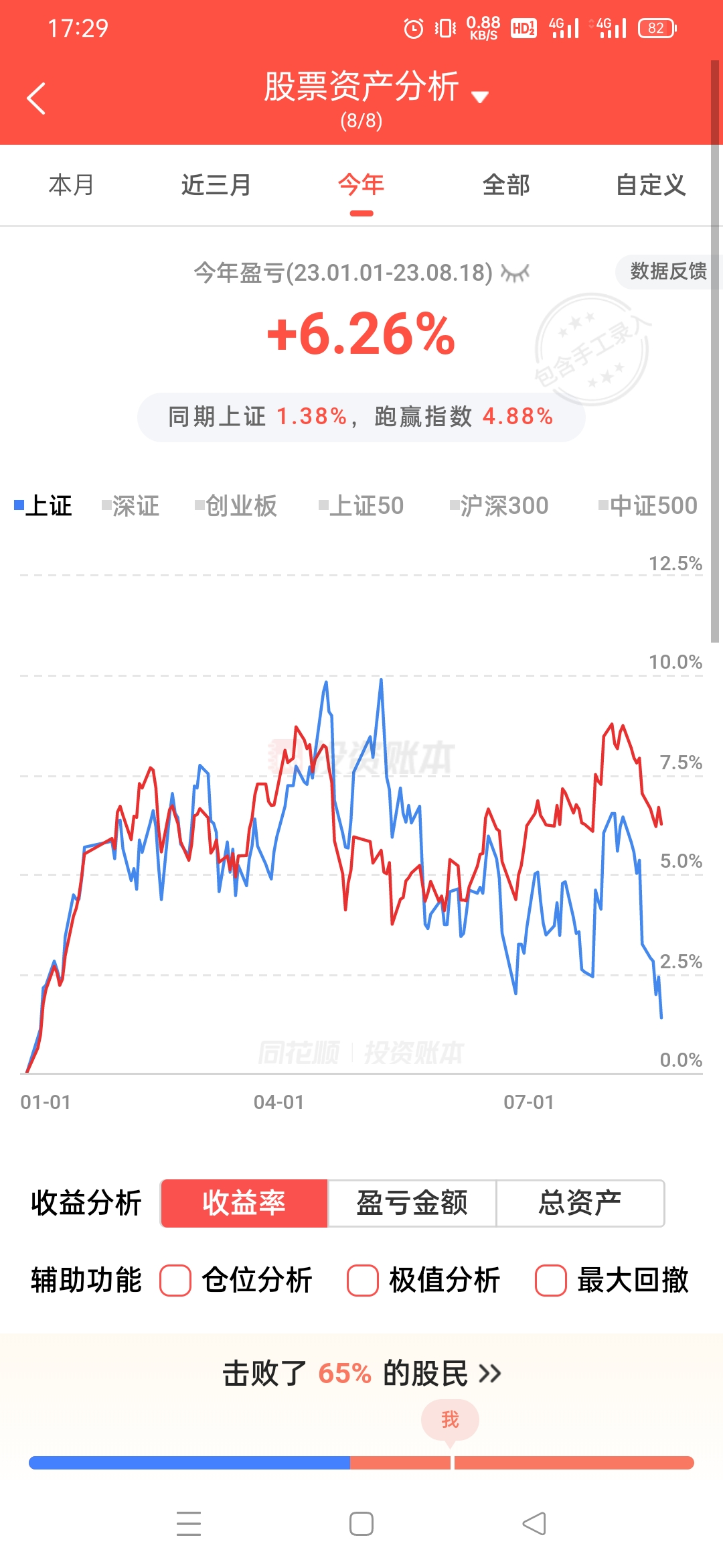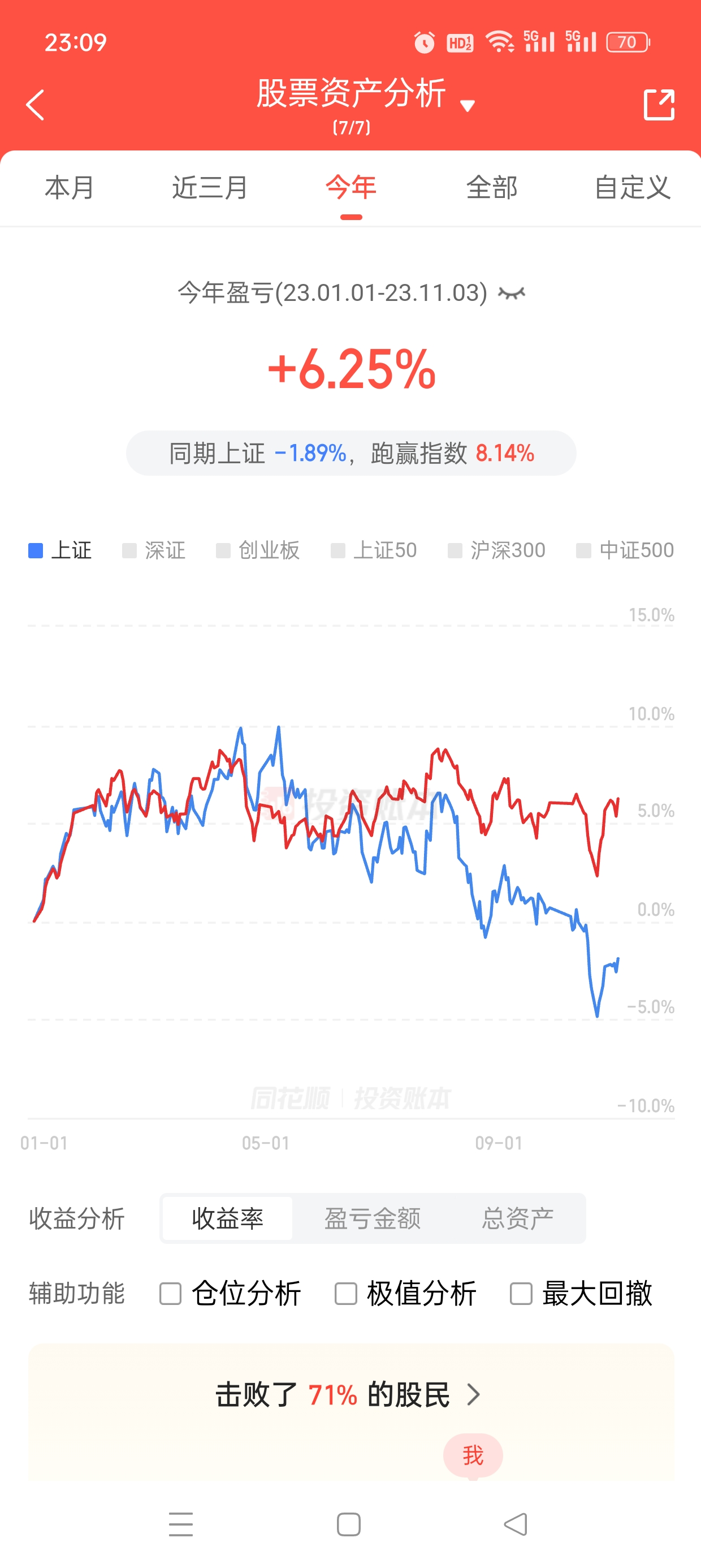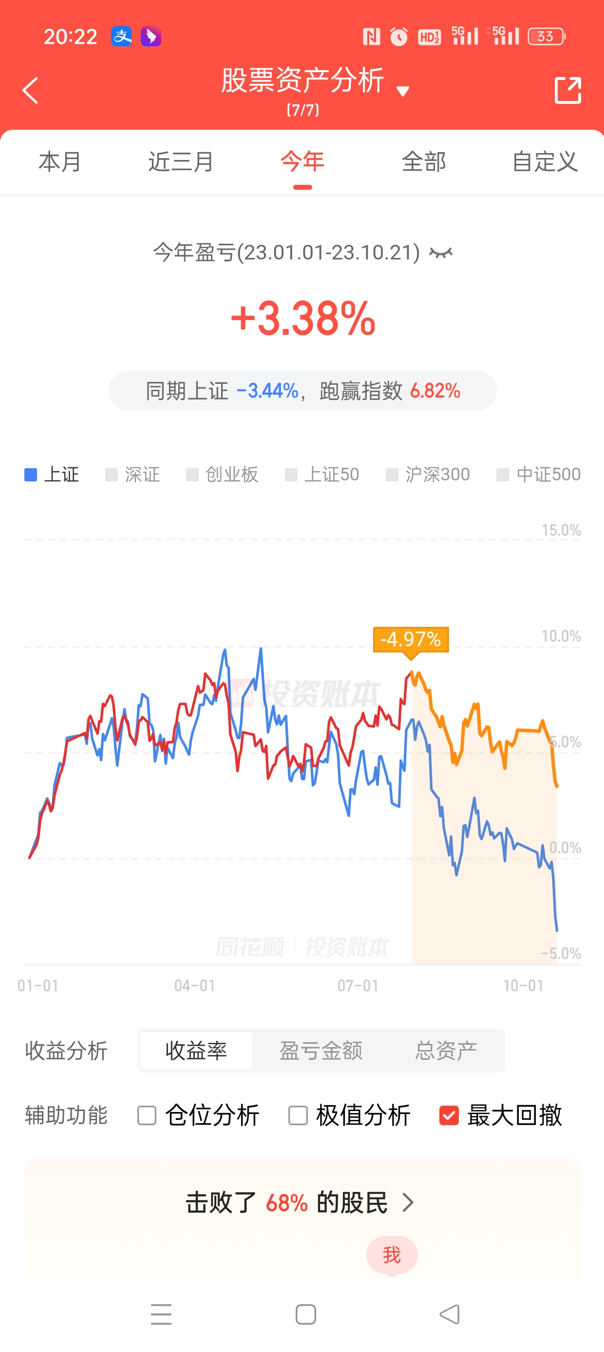本年2.32%,目前仓位46%,仓位太低这周踏*了不少,没办法,一是熊市思维没改过来,二是腾挪账户开科创,北交所,减了没及时加上去。