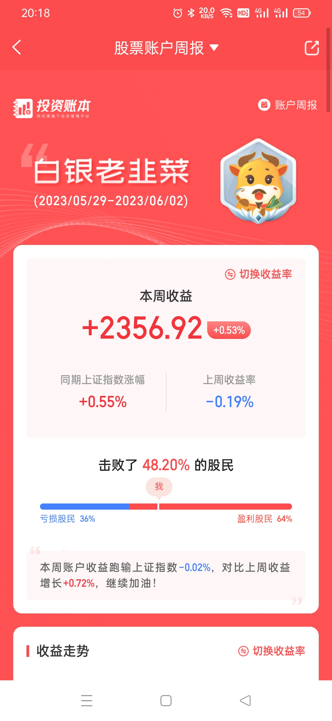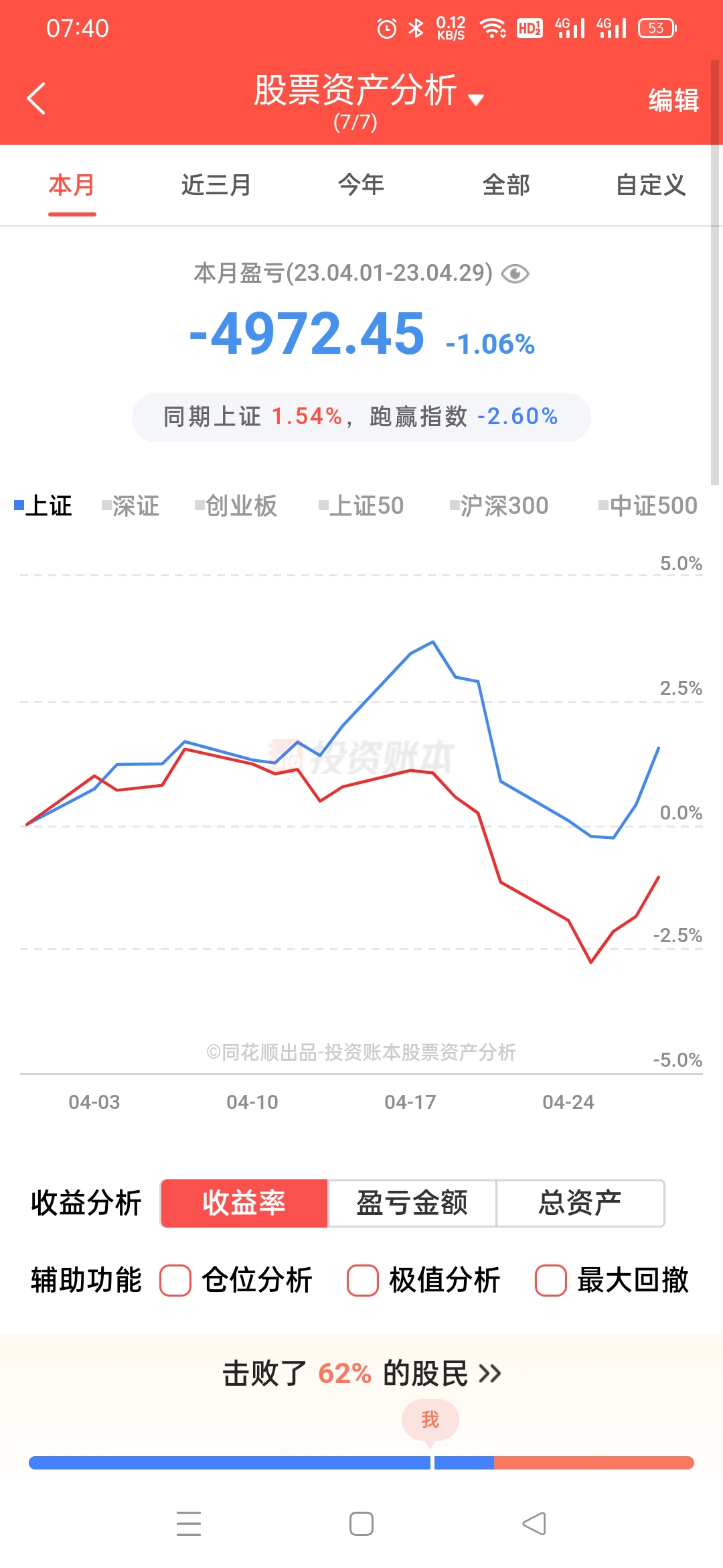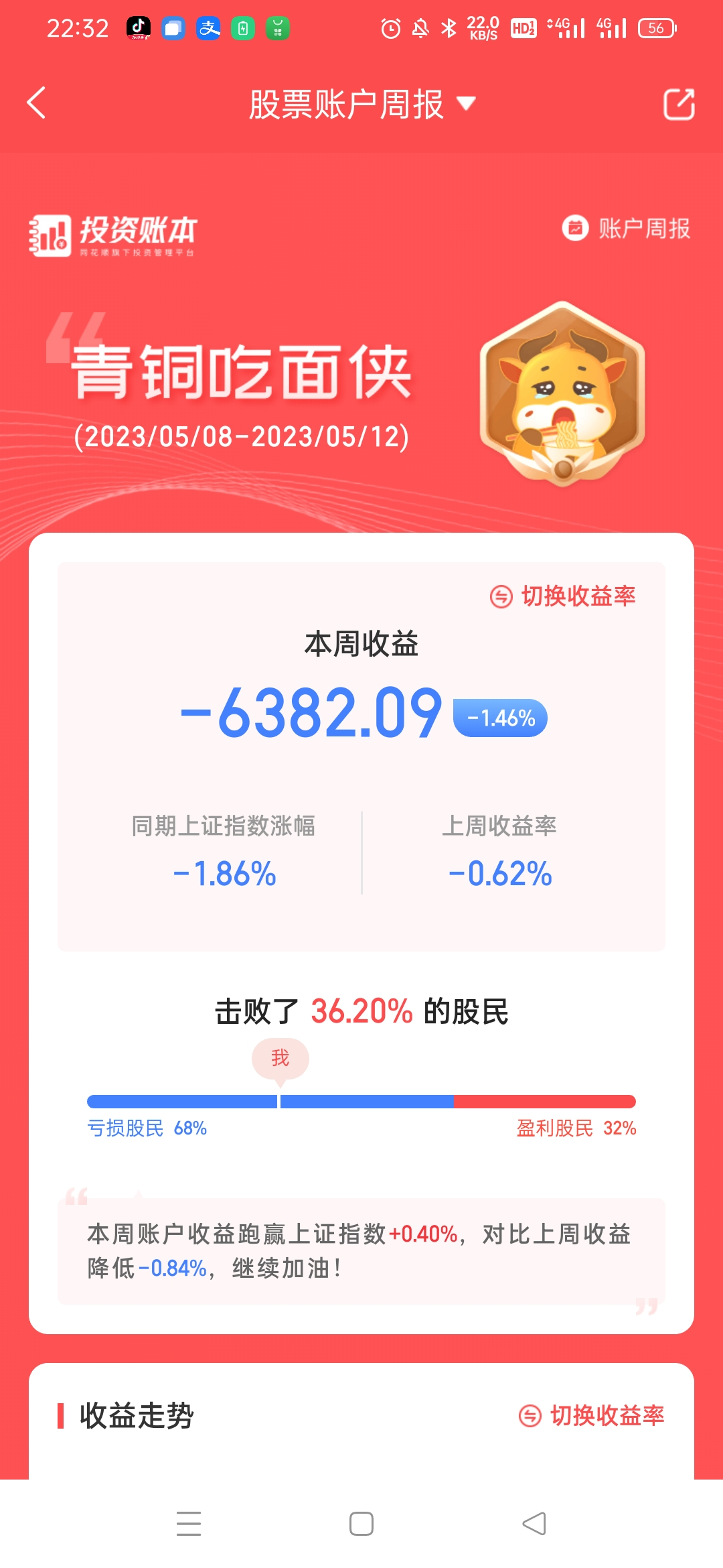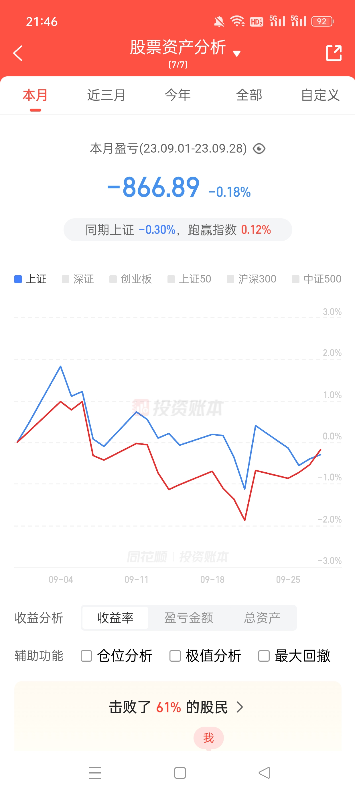 本年2.32%,目前仓位46%,仓位太低这周踏*了不少,没办法,一是熊市思维没改过来,二是腾挪账户开科创,北交所,减了没及时加上去。