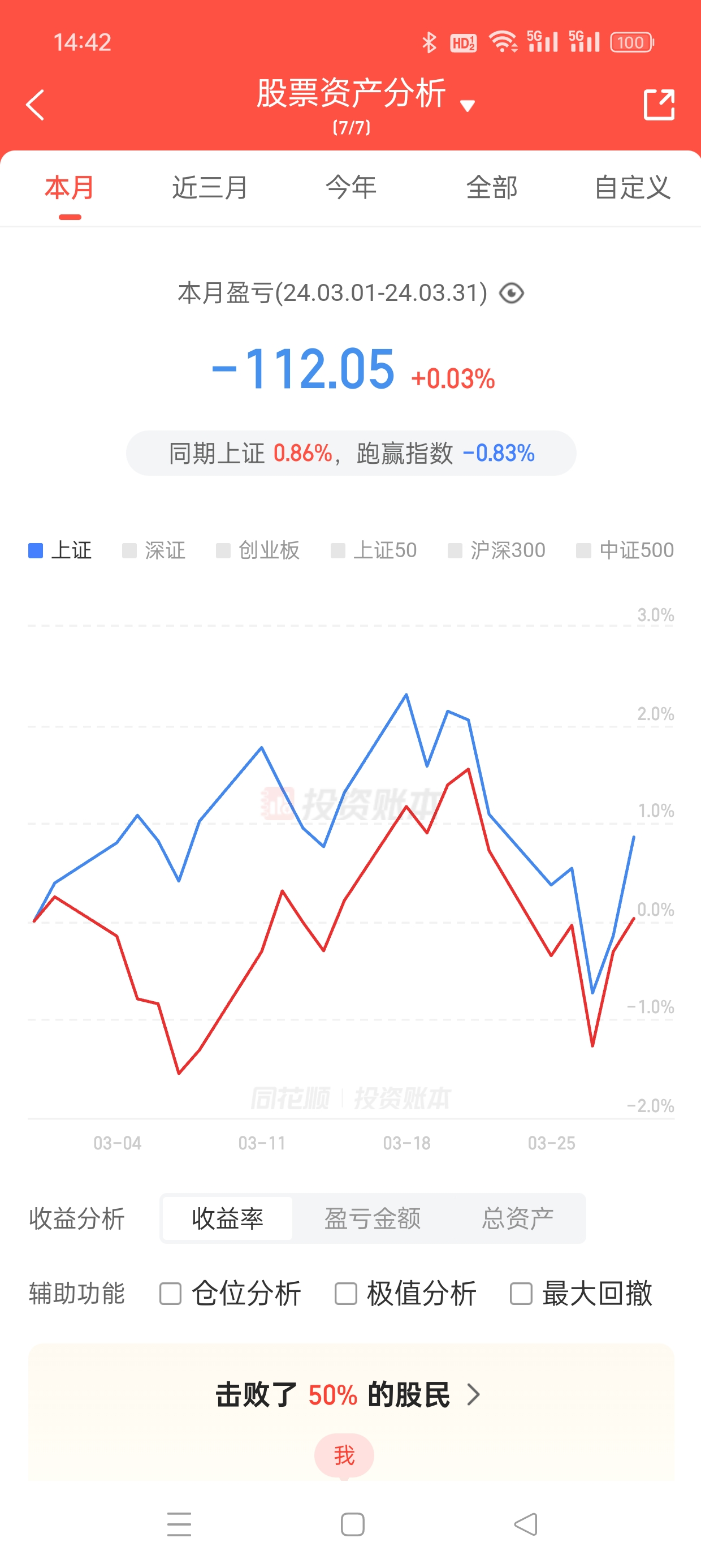 三月收官-0.1%,几乎平盘,目前来看今年不乐观,唯一庆幸的是还有5成现金,后续有更好的加仓机会,不急慢慢熬。
