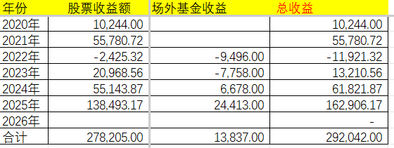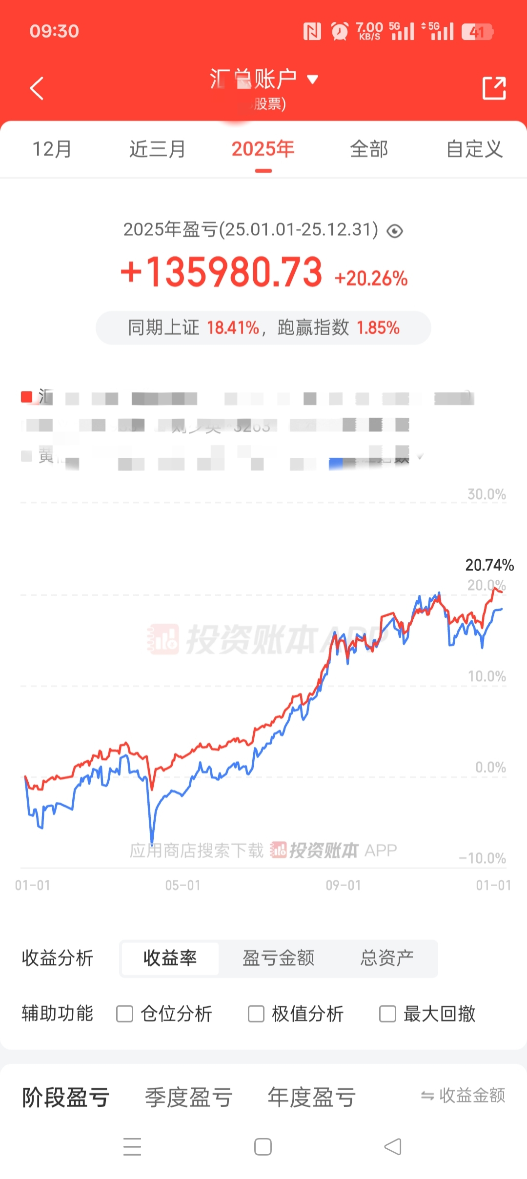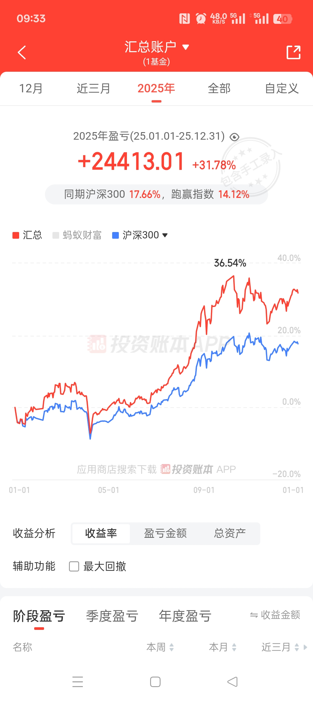 2025年收官,场外基金收益31.78%,场内自己操作的部分20.26%,合计本年盈利金额:16.29万,超过2020年以来的总和,历史总投入66.5万,历史总盈利29.20万,没离开市场总归也只是浮盈,目前仓位62.5%,对2026年总体上不抱有太大的预期,随行就市就行,毕竟现金还有37.5%,大跌就加仓,保住胜利果实最重要。