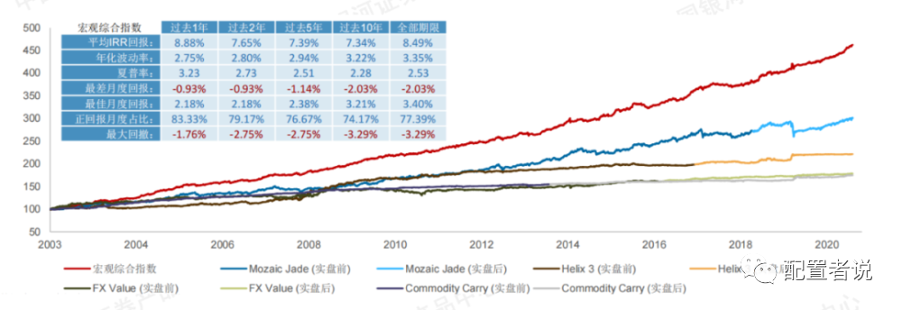 摩根大通宏观综合指数(彭博代码:JMAB390E)指数自2003年1月1日开始回测、 2021年8月12日开始实盘,历史平均年化收益率8.49%,年化波动率3.35%,最大回撤-3.29%,夏普率2.53,正回报月度占比77.39%,历史业绩优异,比无杠杆的桥水风险平价好上一些。