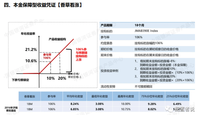 参与率106%,大白话就是杠杆率。1.06倍,18个月后指数涨多少,最终持有人得到1.06倍的涨幅。