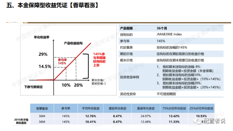这个同样挂钩摩根大通宏观综合指数,参与率是145%,即杠杆是1.45X。