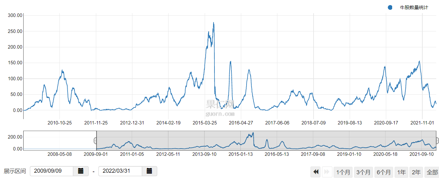 牛股数量统计,统计具有趋势的个股数量。从当前看,行情处于下跌过程,但还没进入极为清淡的时期,以往的熊市末期,数量为个位数甚至为0几个月,才会真的见底。