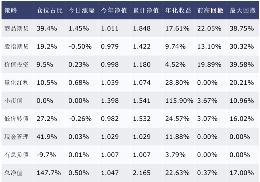 配置:股票策略(高息低估+小市值),可转债和另类投资。