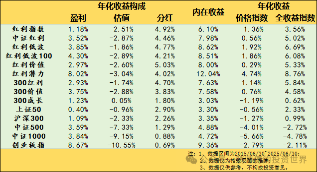 博主把指数的长期收益分为三部分,分红+成长+估值变化。这并不新鲜,但数据是意义的。