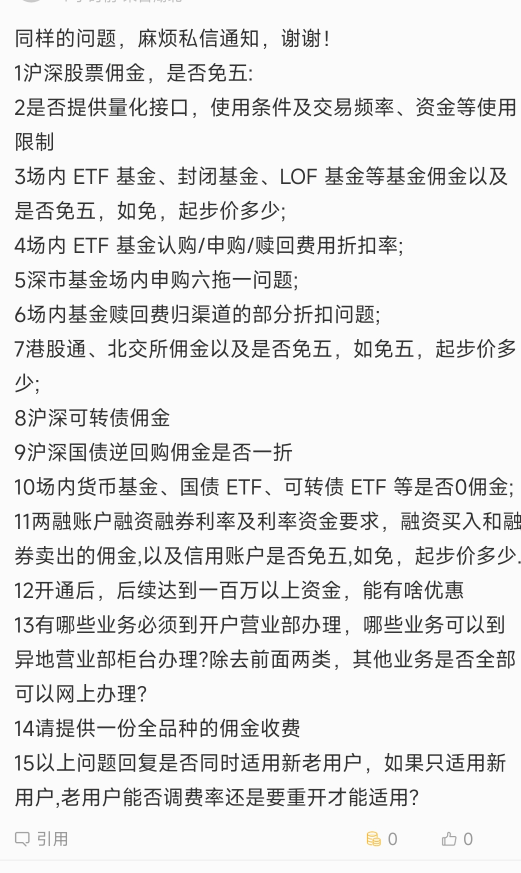 6场内基金赎回费归渠道的部分折扣问题;7港股通、北交所佣金以及是否免五,如免五,起步价多少;8沪深可转债佣金