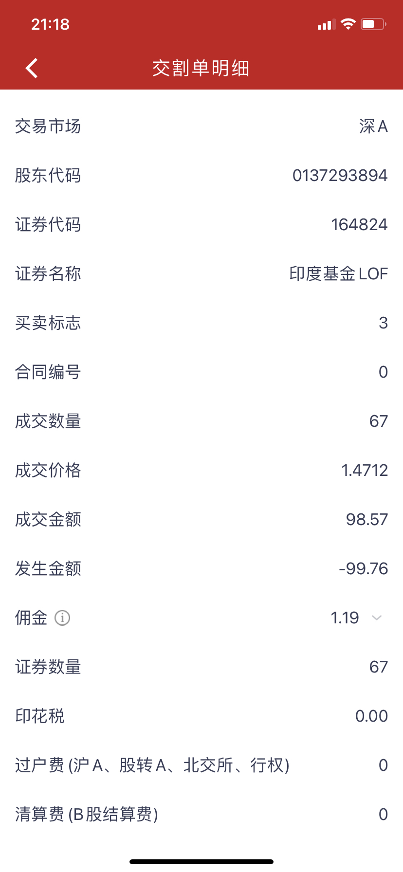3、场内LOF申购费打折的实现方式为:全额冻结申购款,按不打折费率给基金份额,在交割时会只扣除申购到的基金市值 优惠后的申购费,剩余资金会自动解冻回到账户;自己核对申购的方式:交割单——用手续费/成交金额=真实申购折扣;