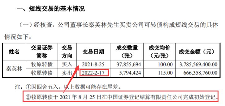 牧原股份今天公告,董事长卖出可转债构成了短线交易,收益有8000多万都上缴公司了