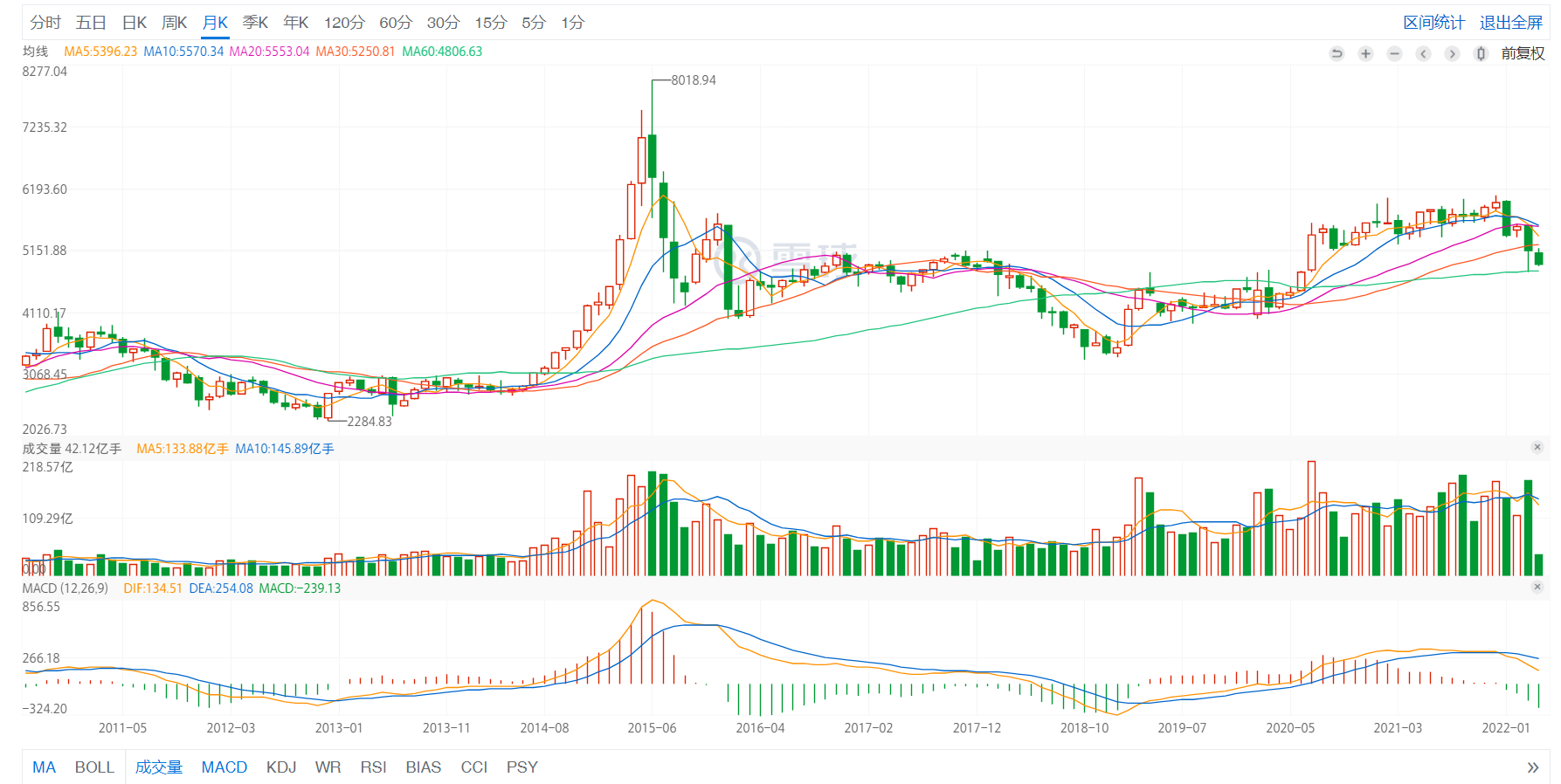 中证全指月K,复习一下15~16股灾的成交量。