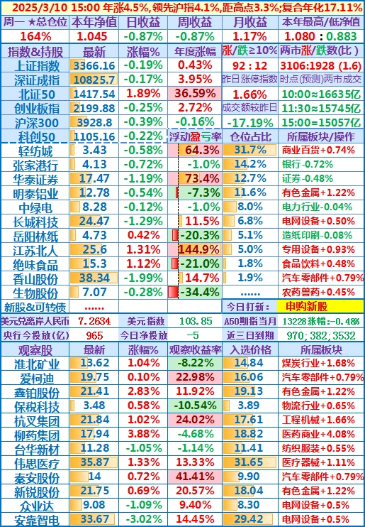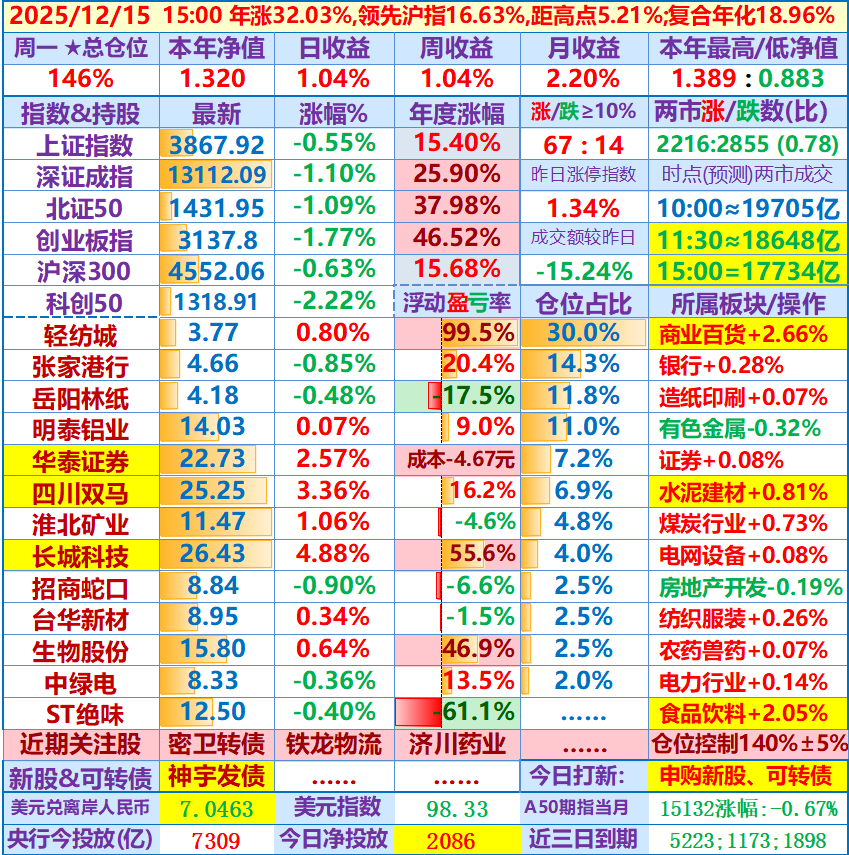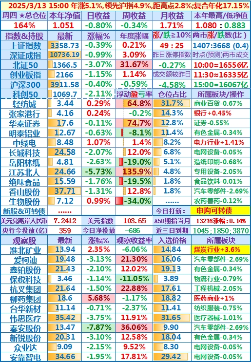 ★★操作(观察):北交所今日有新股申购。继续持股为主,或择机操作避险……开盘5分钟,个股涨跌比0.4,两市成交额量级约2.9万亿。碳市场重磅政策,岳阳林纸受益,高开6.85%(开盘价5.30元),现有所回落。市场有些弱,但看情形,涨跌比正在回升……10时,个股涨跌比1.2,两市成交额量级约2.82万亿。成交额有所减少,但不明显,市场氛围看似不错,个股涨跌多少。重仓股轻纺城较强,账户年收益率刚好突破35%……中午收盘,沪指3888点整数收盘了,个股涨跌比1.7,两市成交额量级约2.7万亿。账户本年收益维持在+35%……收盘,个股涨跌比1.2,两市成交额2.68万亿。持股4涨9跌,轻纺城较强,岳阳林纸今天冲高回落,下跌的股也比较抗跌,今日账户本年净值续创新高……