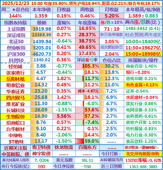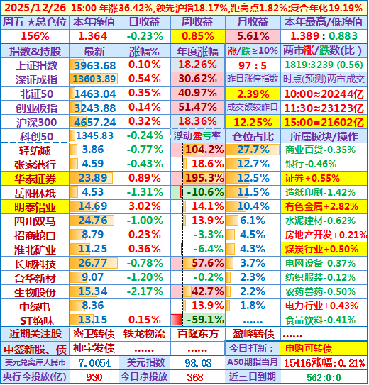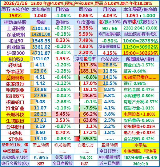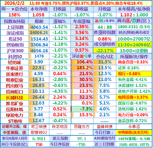 收盘,个股涨跌比1.31,两市成交额1.97万亿。账户持股4涨9跌,今天账户跌1.42%,本周收官,涨1.15%……