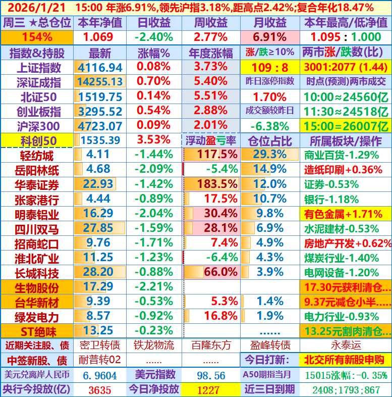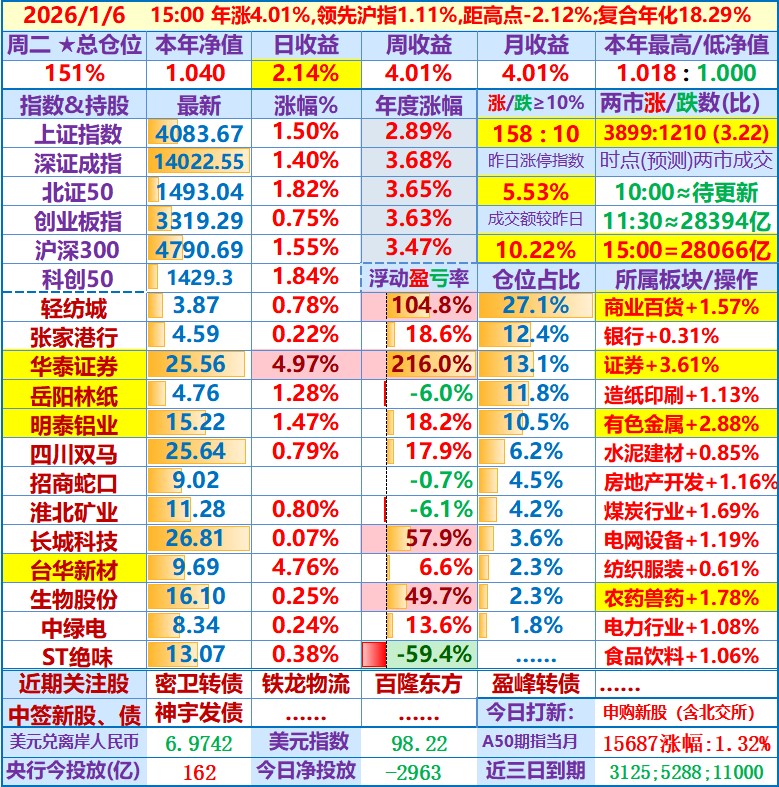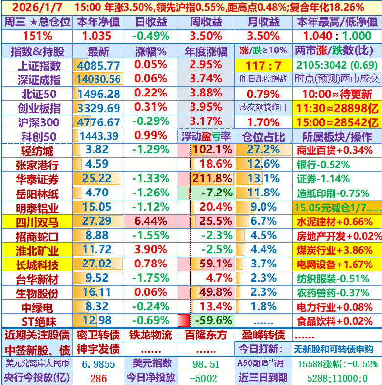 收盘,个股涨跌比0.75,两市成交额约2.91万亿。持股6涨7跌,因重仓股轻纺城及另3个仓位合计近21%的持股涨幅明显,今日账户涨幅跑赢大盘。本年净值收盘创出本年新高(累计净值创历史新高),到了1.051.……