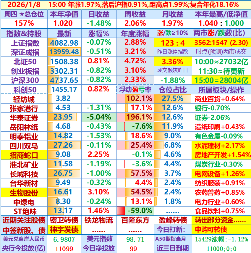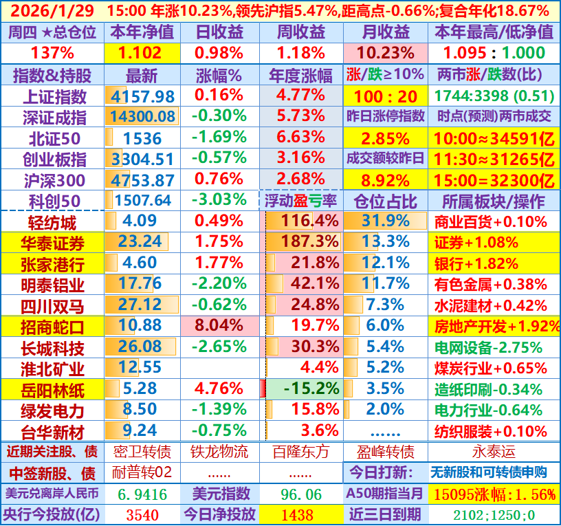 收盘,个股涨跌比1.02,两市成交额约3.94万亿。持股3涨10跌,因重仓股轻纺城涨幅大,在持股涨跌比跑输的情况下仍跑赢沪指和沪深300指数日涨幅。不过,本年净值收盘并没有创出新高,回到1.040下方.……