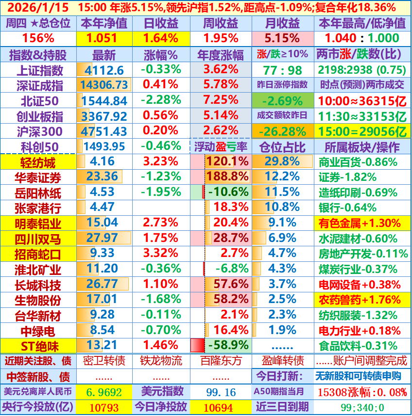 收盘,个股涨跌比0.51↓,两市成交额约3.23万亿↑。持股5涨1平5跌,涨幅前三:招商蛇口+8.04%、岳阳林纸+4.76%、张家港行+1.77%。账户日收益+0.98%,账户本年净值创新高……