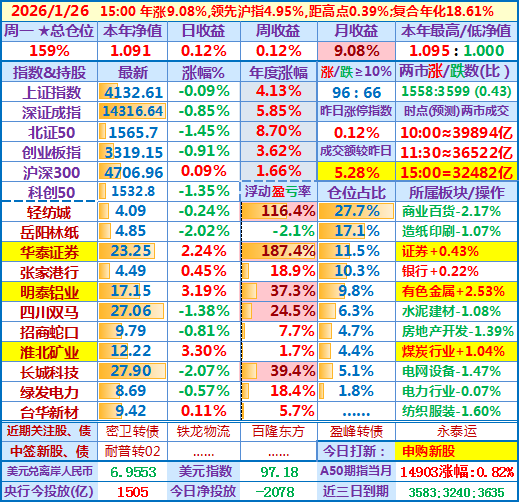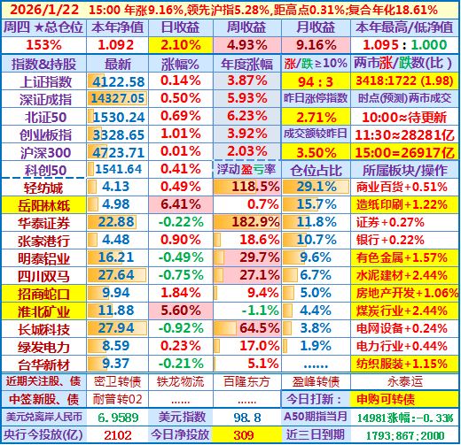 收盘,个股涨跌比0.92,两市成交额2.26万亿。账户持股9涨2平2跌,有色和证券板块在持股板块涨幅上居前,今天账户+1.08%,近期一部分重仓股涨幅不明显,账户离新高仍有0.95%的差距……