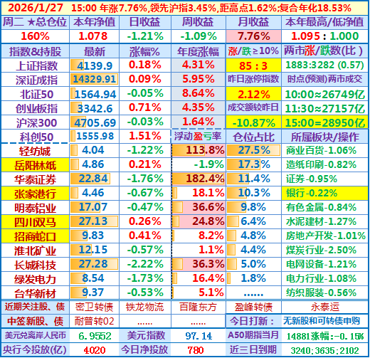 收盘,个股涨跌比4.57,两市成交额2.07万亿。账户持股9涨4跌,账户净值+0.7%(同昨日)……