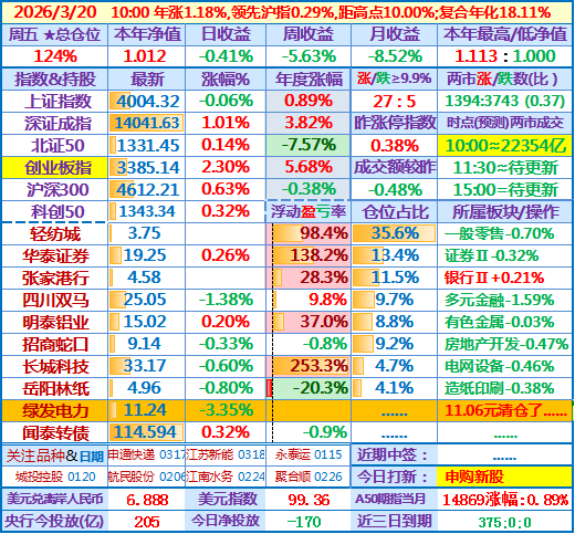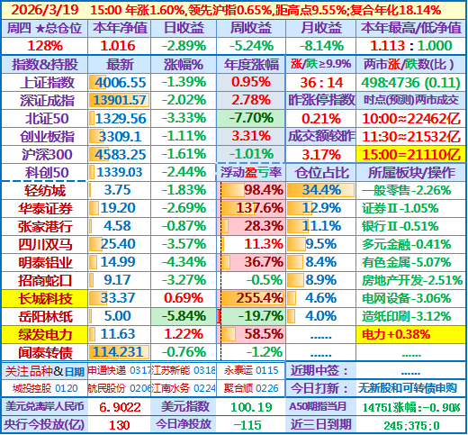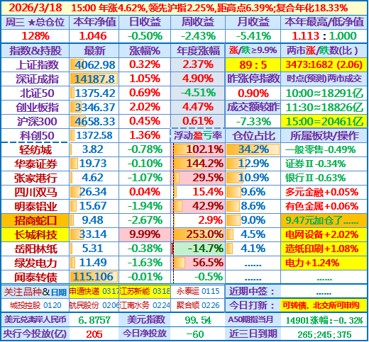 ★★2026-03-18:本年净值1.046,日收益-0.50%。仓位128%(比昨天高了约4%)……楼主挺厉害,还是正收益,我已经深深潜入水底了。有个问题请教楼主,我看第一大和第二大重仓股今年以来都是跌的,而且华泰证券跌幅还不小,楼主今年主要是通过什么获取了正收益