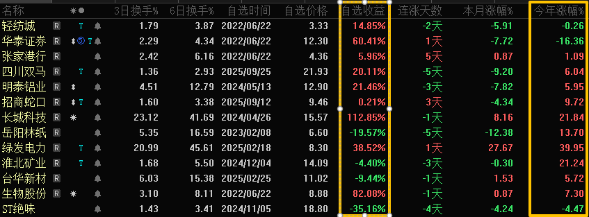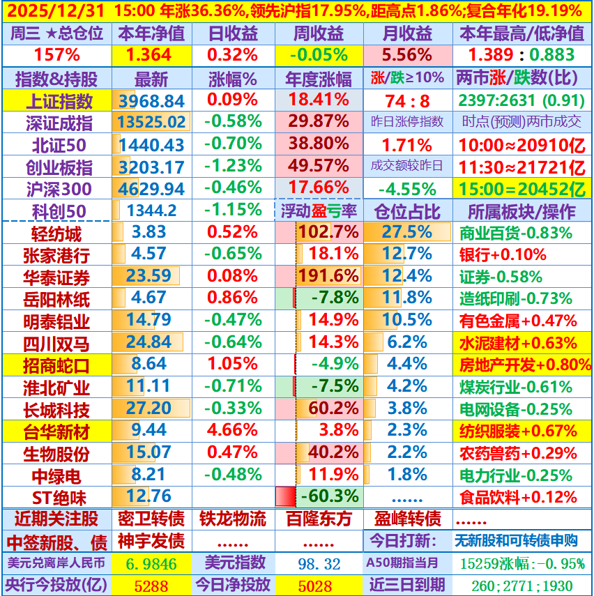 楼主挺厉害,还是正收益,我已经深深潜入水底了。有个问题请教楼主,我看第一大和第二大重仓股今年以来都是跌的,而且华泰证券跌幅还不小,楼主今年主要是通过什么获取了正收益感谢你的提问,也让我顺便理了一下思路:2026年至今我账户里减仓的有明泰铝业、张家港行、轻纺城、岳阳林纸和长城科技,清仓的有淮北矿业、台华新材、生物股份和ST绝味……从下图(图一)可见,主要在于轻纺城今年跌幅仅-0.26%,虽然华泰跌幅-16.38%,但其它股今年表现大都过得去,特别是长城科技、生物股份、明泰铝业和绿发电力表现较佳,所以今年获得了正收益……附上去年底的账户情况图(图二)帮助对比分析……