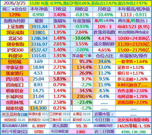 ★★2026-03-25:本年净值0.990,日收益+3.40%,仓位129%(加仓了招商蛇口)……