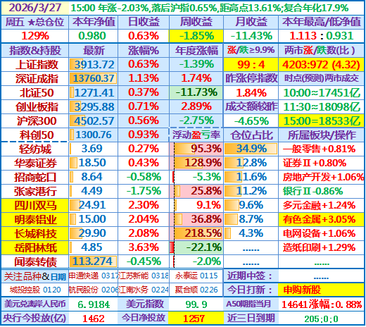 ★★2026-03-27:本年净值0.980,日收益+0.63%。仓位129%……