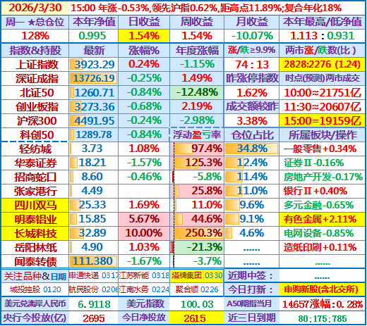 ★★2026-03-30:本年净值0.995,日收益+1.54%。仓位128%……