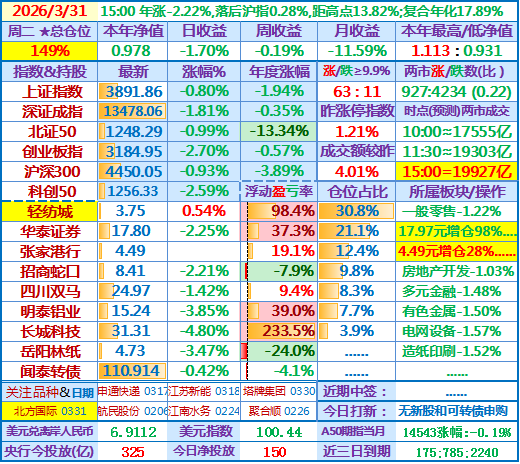 ★★2026-03-31:本年净值0.978,日收益-1.7%,本月收官,月收益-11.59%。仓位149%(增仓了华泰证券和张家港行)……
