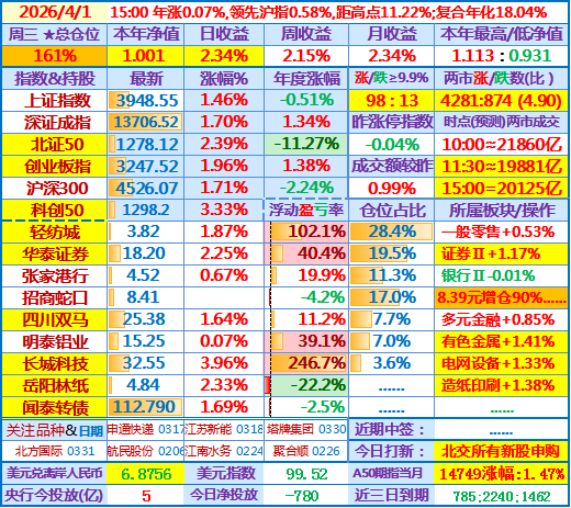 ★★2026-04-01:本年净值1.001,日收益+2.34%。仓位161%(补仓了招商蛇口)……