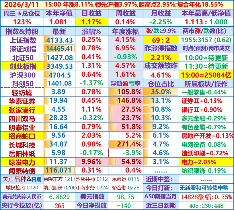 中午收盘,两市涨跌比0.81,成交额量级2.46万亿。目前账户日收益+0.31%,本年净值1.091……